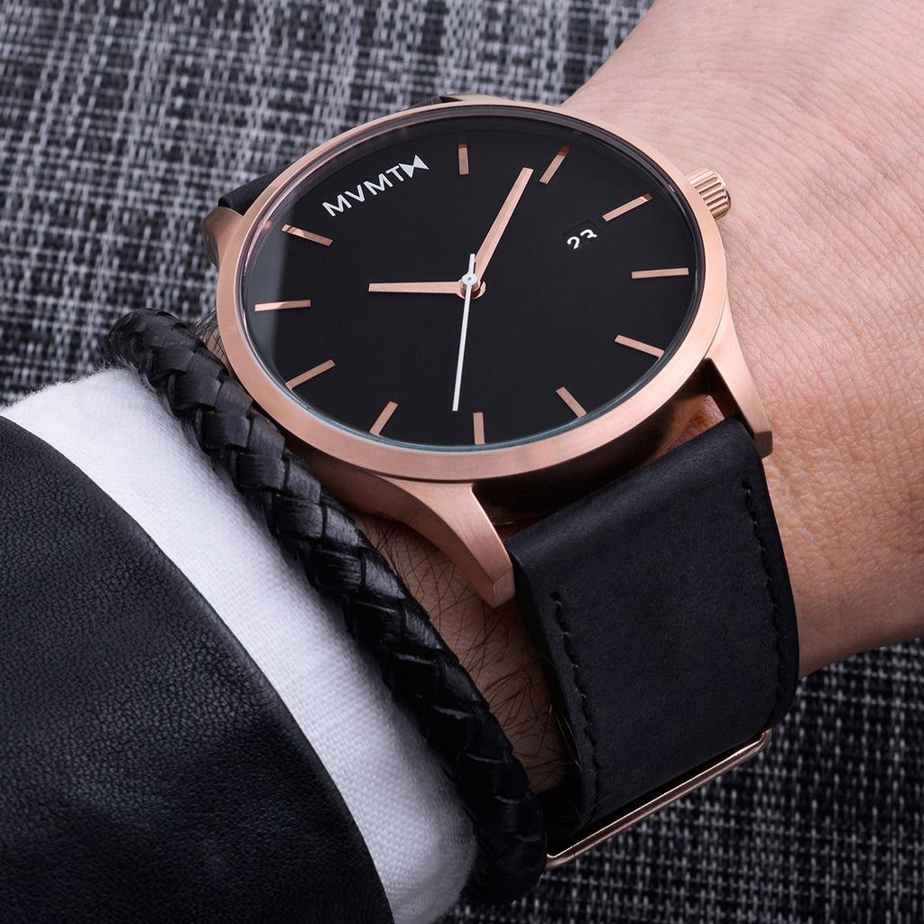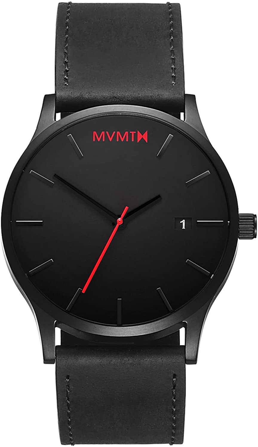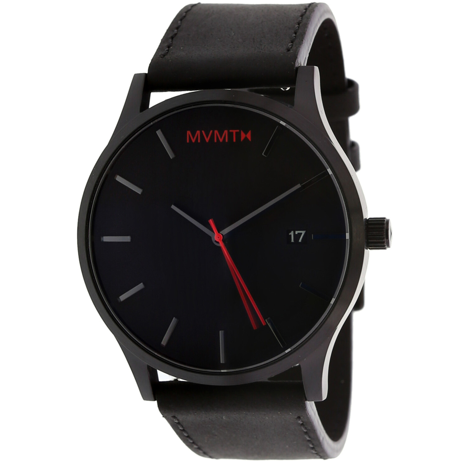 Black ion-plated stainless steel case with a black leather strap. Fixed black ion-plated bezel. Black dial with black hands and index hour markers. Minute markers around the outer rim. Dial Type: Analog. Quartz movement. Scratch resistant mineral crystal. Pull / push crown. Solid case back. Round case shape. Case size: 45 mm. Case thickness: 9 mm. Band width: 24 mm. Tang clasp. Water resistant at 30 meters / 100 feet. Functions: hour, minute, second. Casual watch style. MVMT Classic Black Dial Black Leather Mens Watch L213.5L.551.